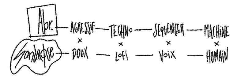 Notre méthode de travail était la suivante : la composition et l’instrumental se construisaient à 50/50. Abr. apportait son savoir-faire rythmique et ses grooves puissants, tandis que je développais un espace mélodique plus doux et aérien, avec des accents rétro. J’ajoutais ensuite un chant pop, avec très peu de traitement : pas de correction de pitch, afin de conserver l’authenticité et la fragilité du chant. Ce parti pris créait un contraste fort avec une instrumentale très structurée.