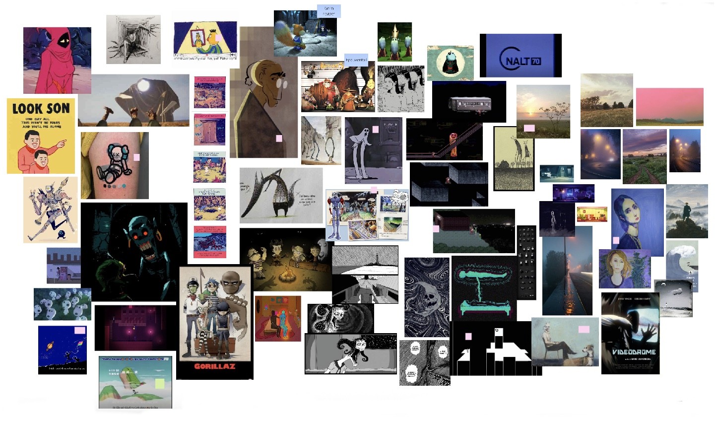 Une longue phase de recherche et d’expérimentation a été nécessaire pour atteindre l’ambition recherchée : création de plusieurs moodboards, analyse de mes références, écriture de récits, storyboards… Cette phase s’est construite comme un processus en entonnoir : partir d’une matière très large, puis affiner progressivement jusqu’aux points clés qui rendent le projet cohérent. L’objectif était de comprendre, avec la plus grande précision possible, ce qui faisait qu’une œuvre me fascinait.