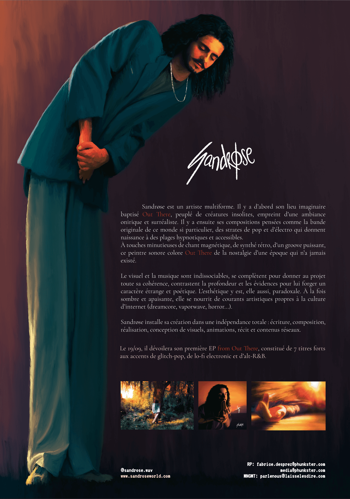From Out There est le premier projet de Sandrøse Studio. Conçu comme une œuvre transmedia, il pose les fondations d’un univers artistique singulier où la musique dialogue avec une narration visuelle (graphisme, images, contenus éditoriaux). Pensé comme une expérience immersive, le projet mêle pop électronique et esthétique surréaliste, le tout construit autour d’un lieu imaginaire et d’un récit à plusieurs niveaux de lecture.
