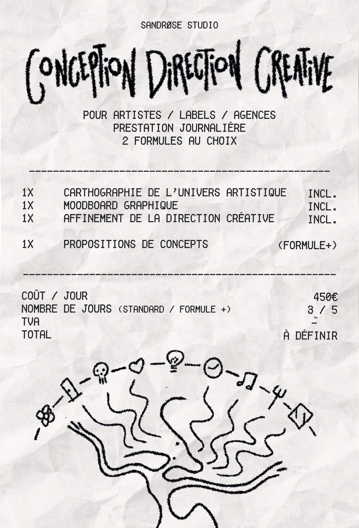 En travaillant ensemble, vous repartez avec un moodboard complet, une cartographie de l’univers artistique, ainsi que trois pistes concrètes de direction créative comprenant des intentions visuelles, des palettes de couleurs, des éléments graphiques et typographiques. Je propose également une formule +, avec des propositions de concepts concrets pouvant porter sur un clip vidéo, des contenus pour les réseaux sociaux, du merchandising, ou d’autres déclinaisons adaptées à l’univers défini.