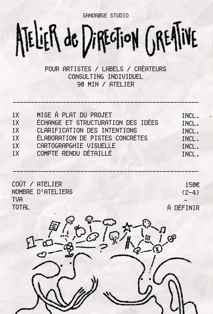 J’ai développé une méthodologie issue de mon regard de designer et de mes différentes expériences pour concevoir cet atelier de direction créative. Centré sur l’échange, l’analyse et des exercices de réflexion, il permet aux artistes et aux professionnels du milieu créatif de clarifier leur vision, d’ouvrir de nouvelles directions fidèles à leur identité, et de mieux comprendre ce qui fait l’essence de leur travail en tant que créateur. Cet atelier est pensé comme un espace de recul, de structuration et d’exploration. Il aide à faire émerger une vision plus claire, à débloquer certaines intuitions, et à transformer des idées diffuses en pistes concrètes et cohérentes.